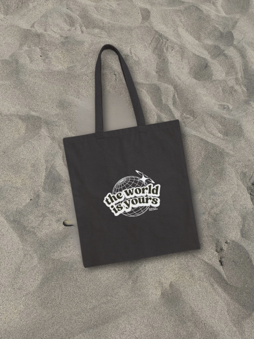 The World is Yours Tote in black. Crafted with 100% cotton canvas. The World is Yours graphic in white on front.